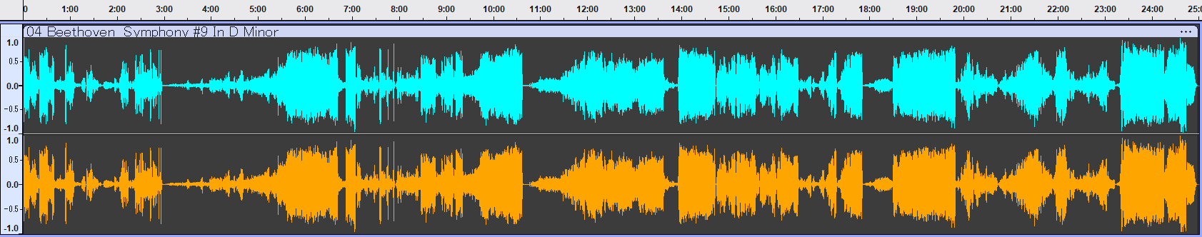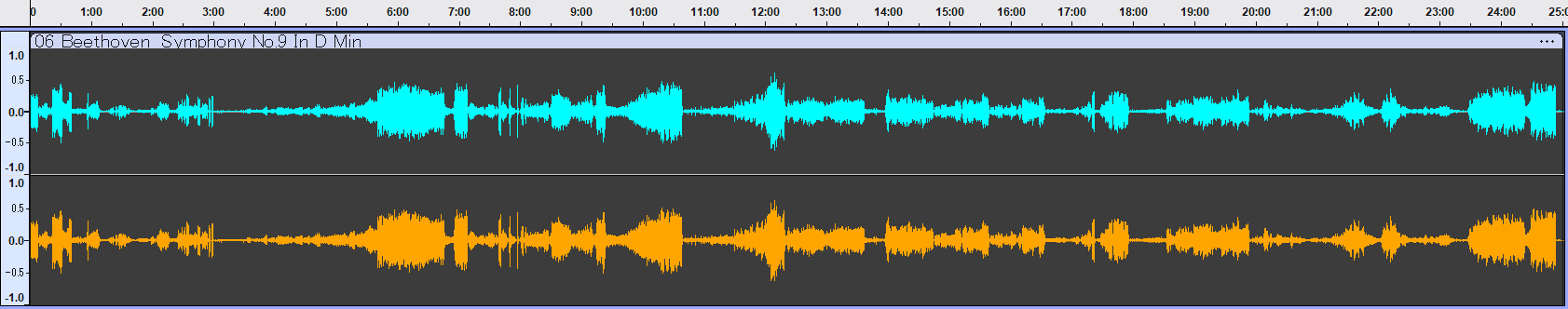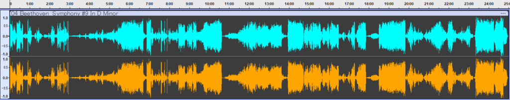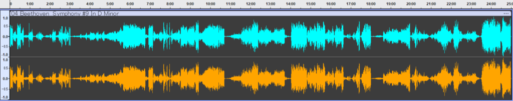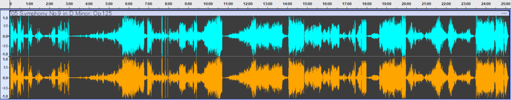 最新のBIS盤と、放送局マスターを元にしたORFEO盤の波形を並べると、先述の2種類(EMI/OTAKEN)とは明らかに異なる傾向が見て取れます。