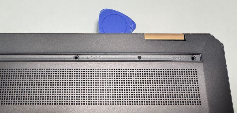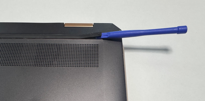 ヒンジ側からヘラを差し込み、パキパキと音を立てながら周囲のツメを外していきます。Spectreは筐体の精度が高いため、慎重かつ大胆に進めるのがポイントです。