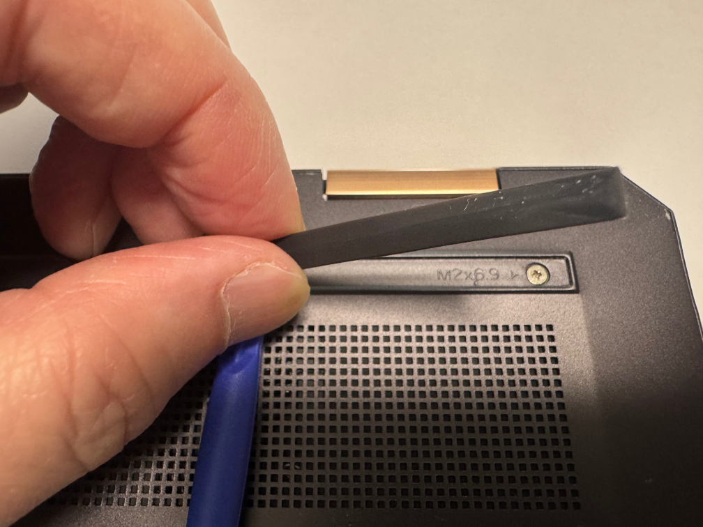 - 注意点: 奥側の長いゴム足の下にネジがありますが、ここで罠があります。ゴム足は「ゴム部分」と、それと同サイズの「プラスチック製の土台」の二層構造になっています。当初、ゴムだけを剥がして「ネジがない!」と悩みましたが、実はプラスチックの土台ごとヘラで浮かせないとネジが現れません。この土台を慎重に外すと、ようやく4本のプラスネジにアクセスできます。