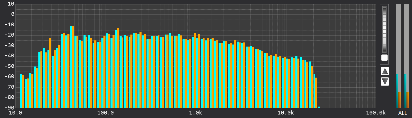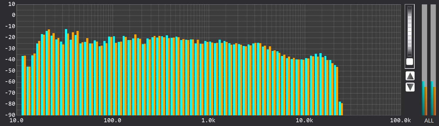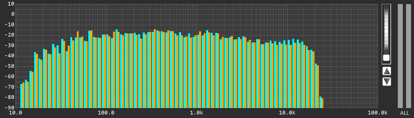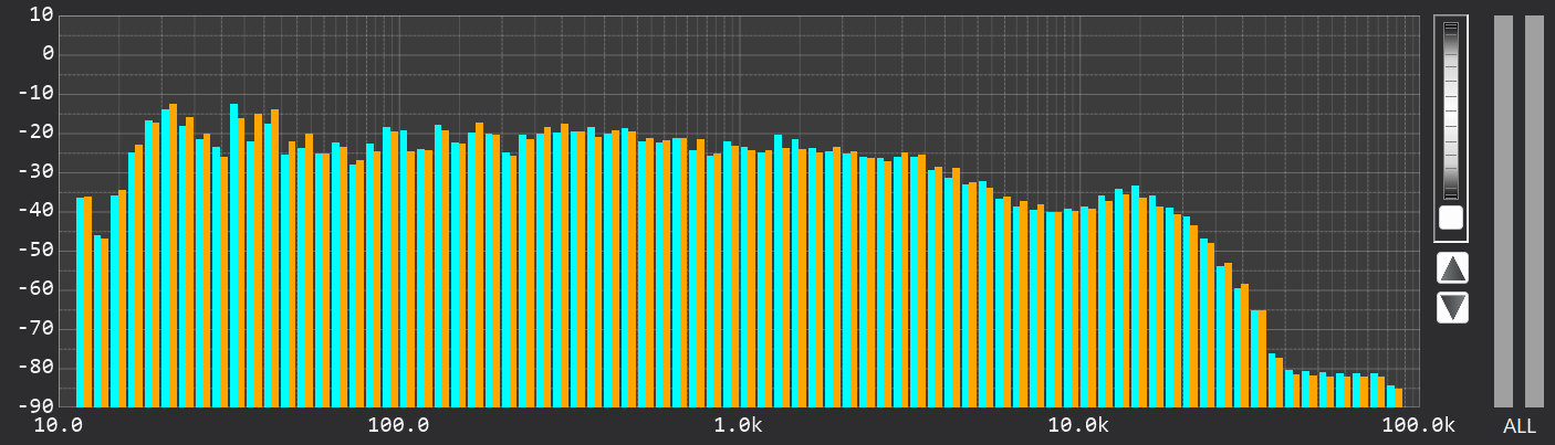CD規格(44.1kHz)のRTAでは、ナイキスト周波数である22.05kHz付近でエネルギーが急峻にカットされています。これに対し、ハイレゾ版では20kHzを超えた先まで緩やかに倍音成分が伸びています。